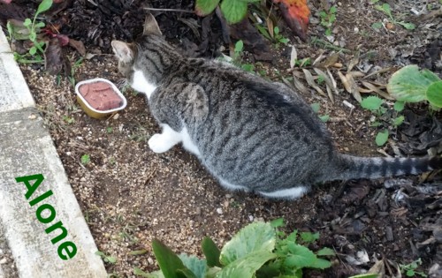 Continuo sem saber se é o Alone ou a Alone...o que é certo, é que tratar e mimar este bichano, já faz parte do meu dia a dia. Por vezes, o bichano quer entrar para dentro do meu prédio. Um dia, estava a chover e custou-me tanto negar-lhe abrigo... até pensei que podia o/a deixar pernoitar na garagem, metia lá uma caixa com uma manta quentinha e outra caixa com areia, água e comida, mas já tive uma situação aborrecida com uma vizinha, aqui há uns anitos quando lá foi parar um gatito bebé...