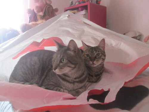 A Amora foi a primeira a entrar no saco de plástico e deitar-se dentro dele. A Becas andou ali por cima, a pisar o saco, e a Amora, até eu abrir o saco e ela se enfiar lá dentro também.